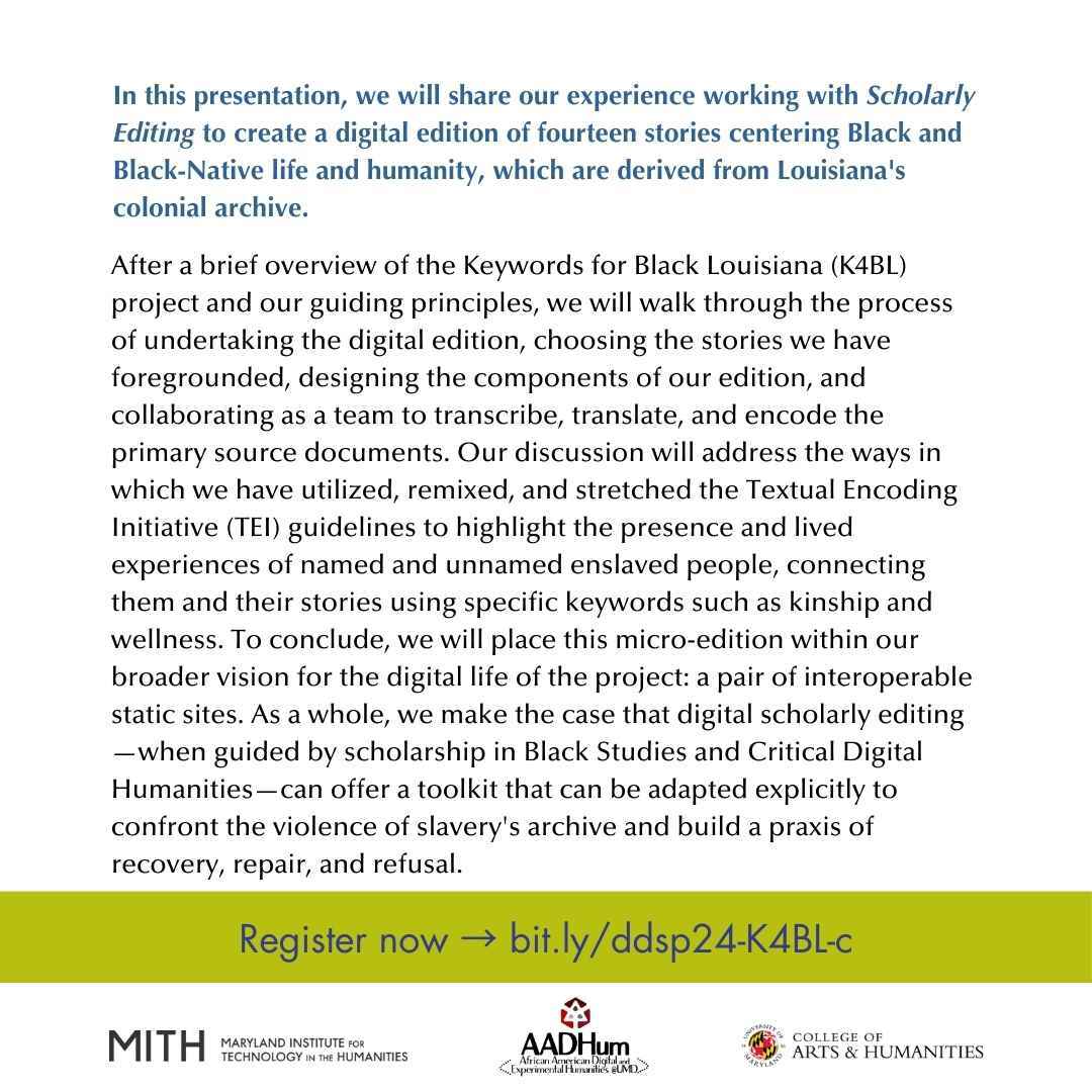 Join us Tuesday April 22 at 5:15pm for Kinship & (Be)Longing: Confronting Slavery's Archive through Critical #BlackDH, a #DigitalDialogues roundtable with the Keywords for Black Louisiana