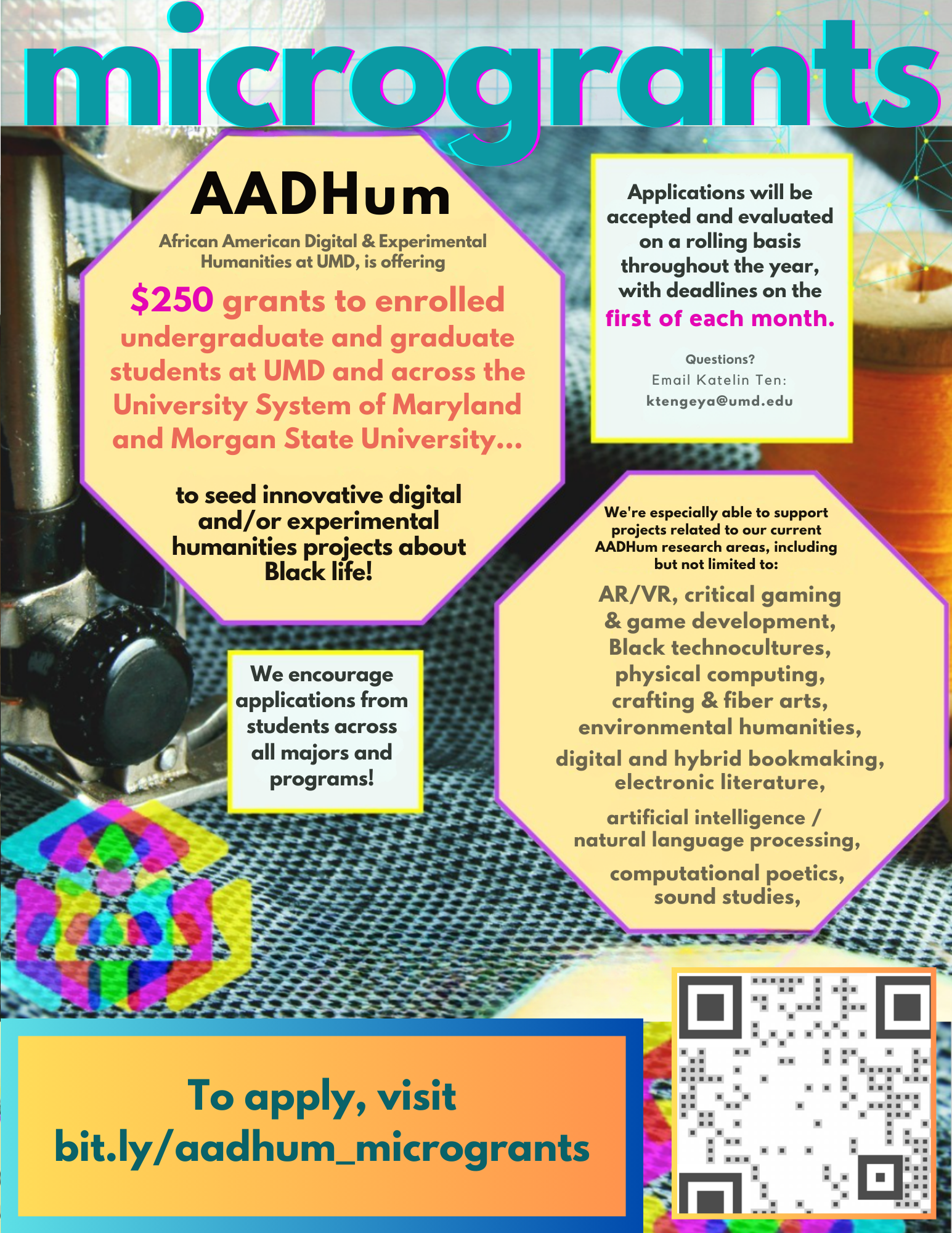 It's important to note that the AADHum microgrant program is open to both graduate and undergraduate students at the University of Maryland, the University System of Maryland, and Morgan State University. Applications are due the first day of every month, through April.