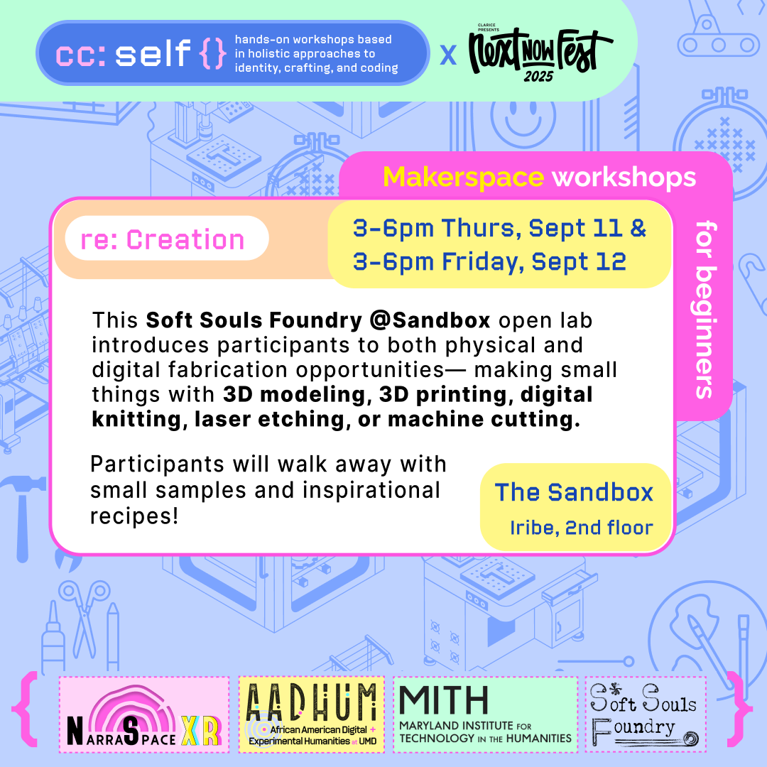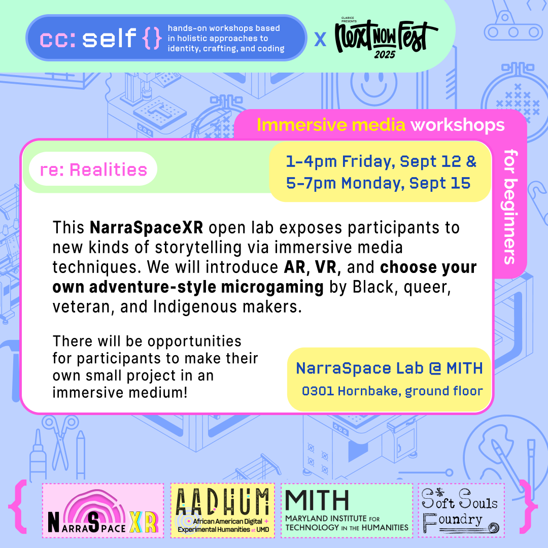 Join AADHum + NarraSpaceXR & the Soft Souls Foundry for this year's Next / Now festival at UMD. You can find us at NarraSpace (housed at MITH), AADHum in Taliaferro, and SSF at the Sandbox, on the 2nd floor of Iribe!