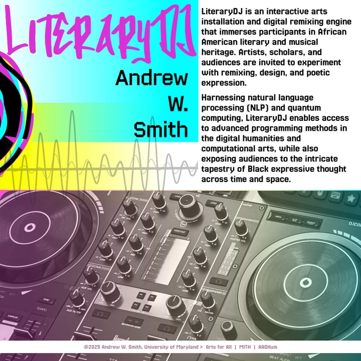 Andrew W. Smith will also be presenting from his recently updated LiteraryDJ project. Come check out this innovative Black DH-inflected, interactive arts installation and digital remixing engine. LiteraryDJ immerses participants in African American literary and musical heritage, while also harnessing natural language processing (NLP) and quantum computing to produce novel tools for composing computational literature. Andrew W. Smith is Visiting Research Professor at AADHum and MITH.