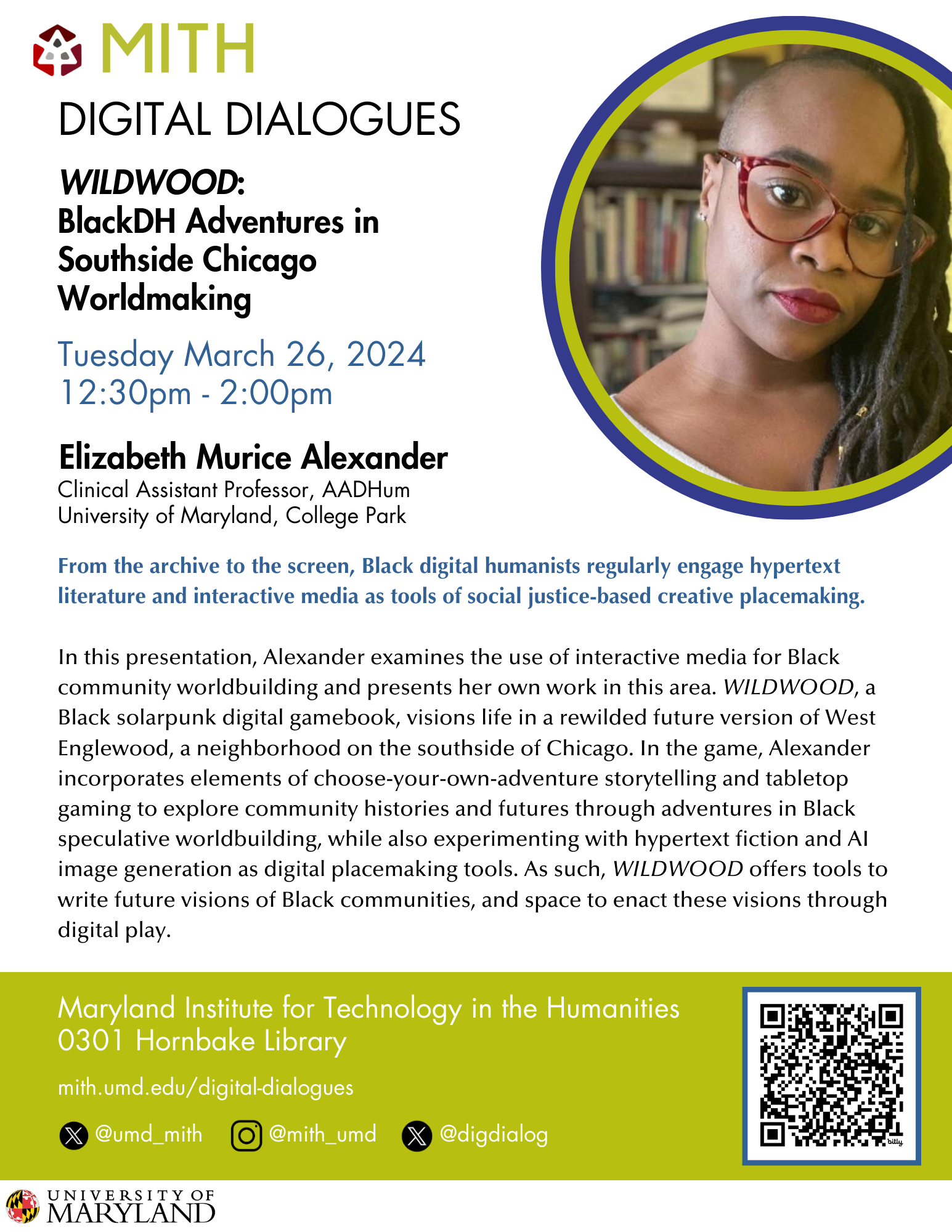 Now in its 40th season, Digital Dialogues convenes prominent digital humanities, new media, and information technology practitioners to present on their field-defining research. The series invites intellectual exchange around topics critical to the digital humanities. Visit mith.umd.edu/digital-dialogues or follow us on social media (X/Twitter, and Instagram) for more details.